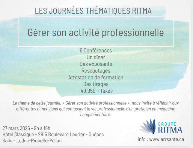Le thème de cette journée, « Gérer son activité professionnelle », nous invite à réfléchir aux différentes dimensions qui composent la vie professionnelle d’un praticien en médecine complémentaire.